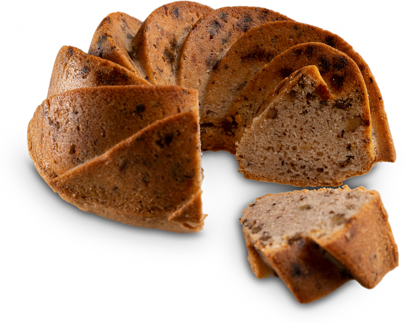 Rýžová mouka, bramborový škrob, tapioková mouka, cukr, vejce, slunečnicový olej, pitná voda, kukuřičný škrob, pohanková mouka, jádra vlašských ořechů, sušené fíky, bourbon vanilka, kypřící látky (dihydrogenfosforečnan vápenatý, hydrogenuhličitan sodný), xanthanová guma.