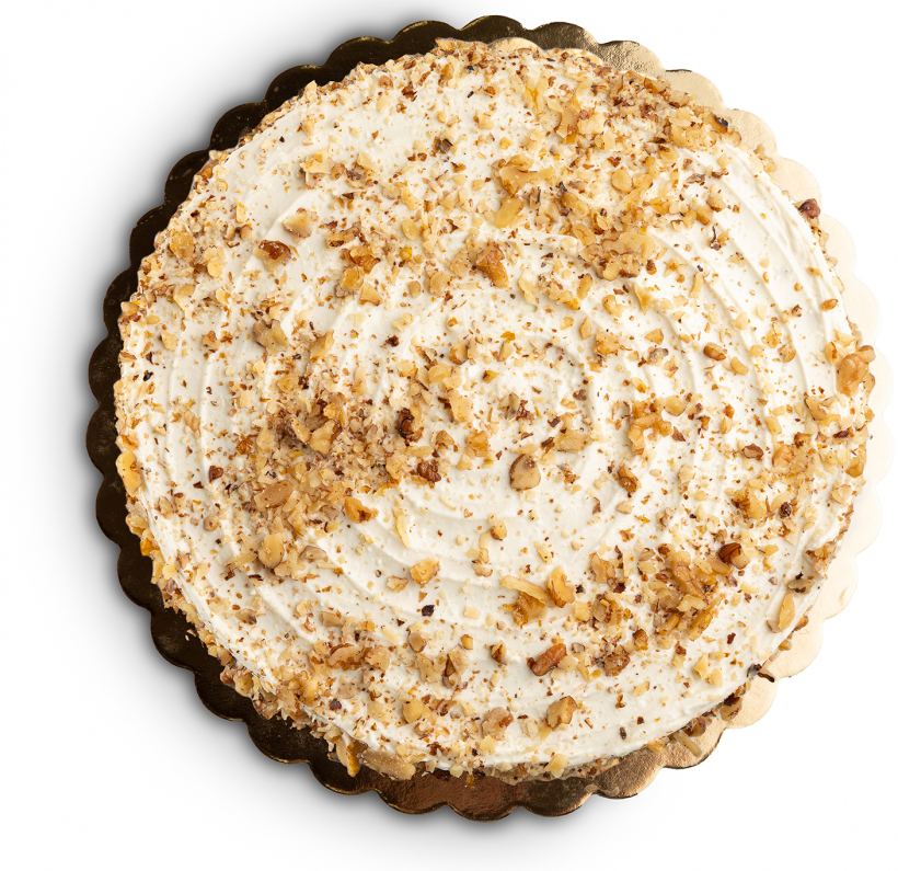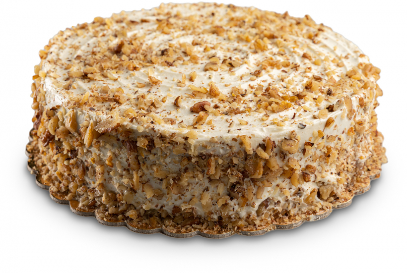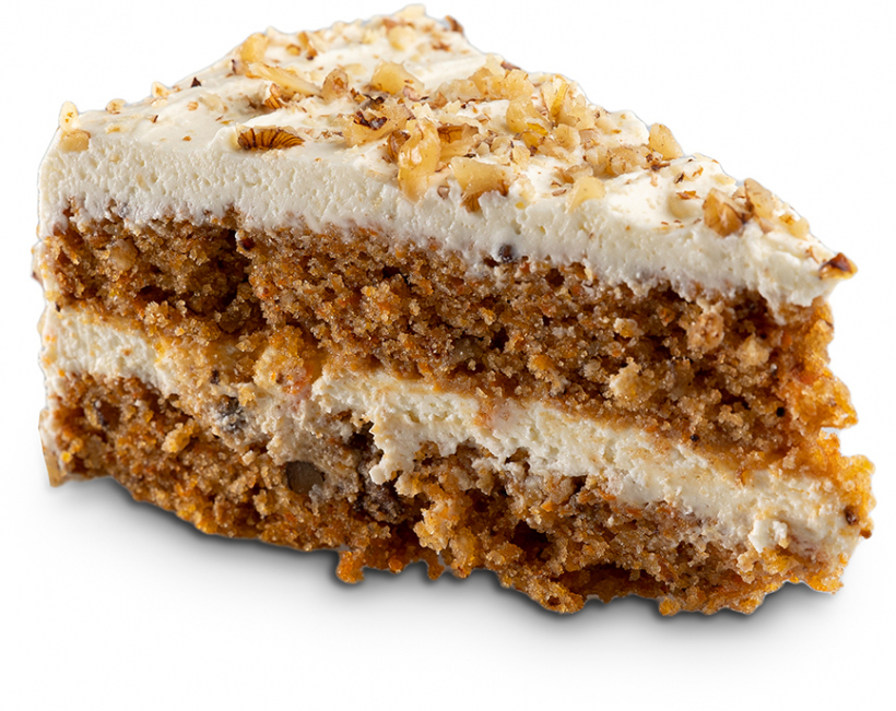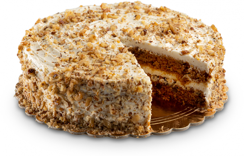 Korpus: Mrkev, slunečnicový olej, cukr, vejce, vlašské ořechy, pohanková mouka, škrob (bramborový, kukuřičný, tapiokový), rýžová mouka, kukuřičná mouka, kypřící látky (dihydrogenfosforečnan vápenatý, hydrogenuhličitan sodný), koření, sůl, stabilizátor (E415), Krém: tvaroh, mascarpone, cukr, smetana