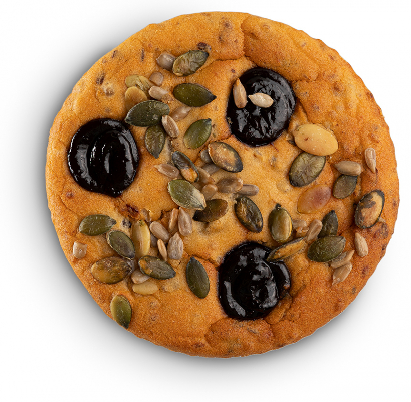 Rýžová mouka, bramborový škrob, tapioková mouka, kukuřičná mouka, pohanková mouka, kefírové mléko, jáhly, pohanka, cukr, máslo, vejce, rozinky, jádra vlašských ořechů, švestková povidla (švestkový polotovar, cukr), chia semínka, slunečnicová semínka, dýňová semínka, kypřící prášek (kypřící látky dihydrogefosforečnan sodný, hydrogenuhličitan sodný, kukuřičný škrob), zahušťovadla (hydroxypropylmethylcelulóza, guarová mouka).