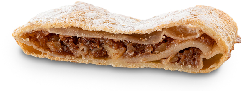 Jablečný závin z našeho jedinečného listového těsta s náplní podle receptu naší babičky. Jablíčka, strouhanka pečená na másle, mandle, rozinky a skořice... ve skvělé kombinaci splňující nejpřísnější pravidla, jak by měl takový super závin chutnat.