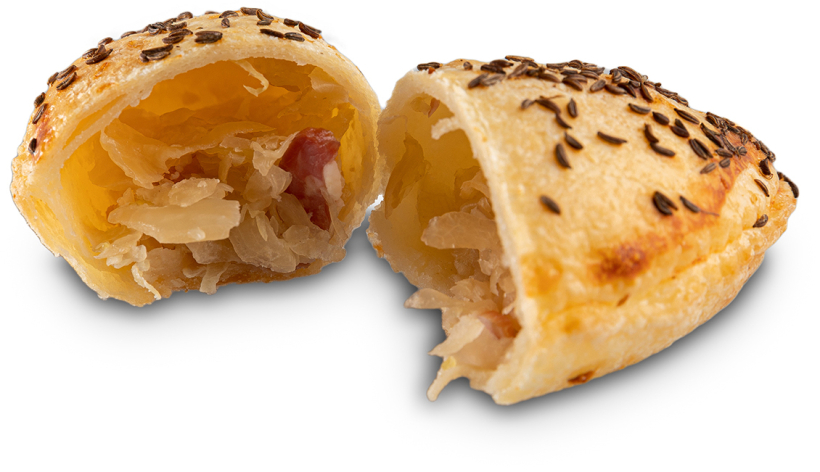 Těsto: škrob (kukuřičný, rýžový), margarín (rostlinné tuky a oleje (řepkový, kokosový, slunečnicový), voda, emulgátor E471, regulátor kyselosti E330 a E331, jedlá sůl, přírodní aroma, barvivo betakaroten), mouka rýžová, vláknina (z čekanky, z indického jitrocele), stabilizátory (E464, E412), dextróza, sójová bílkovina, sušený tuk (slunečnicový), emulgátor (E322), kypřící látky (E450, E500). Náplň: zelí kysané (zelí bílé, voda, jedlá sůl, kmín, konzervant: E202 sorban draselný), anglická slanina 95 % masa (vepřové maso, voda, sůl, konzervanty E326, E250, E243, dextróza, antioxidanty E331, E301, aroma, extrakt z koření).