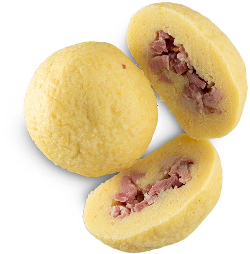 Náplň: uzená krkovice (Vepřové maso 95%, voda, DSS, stabilizátor E450, E451, zahušťovadlo E470a, cukr, antioxidant E310, aroma, extrakt koření, dextroza), těsto: pitná voda, bramborové vločky, vařené brambory, vařené jáhly (12 %), rýžová mouka, škrob (bramborový, kukuřičný, tapiokový), sůl, stabilizátory (E415, E464), kukuřičná mouka, koření sůl.